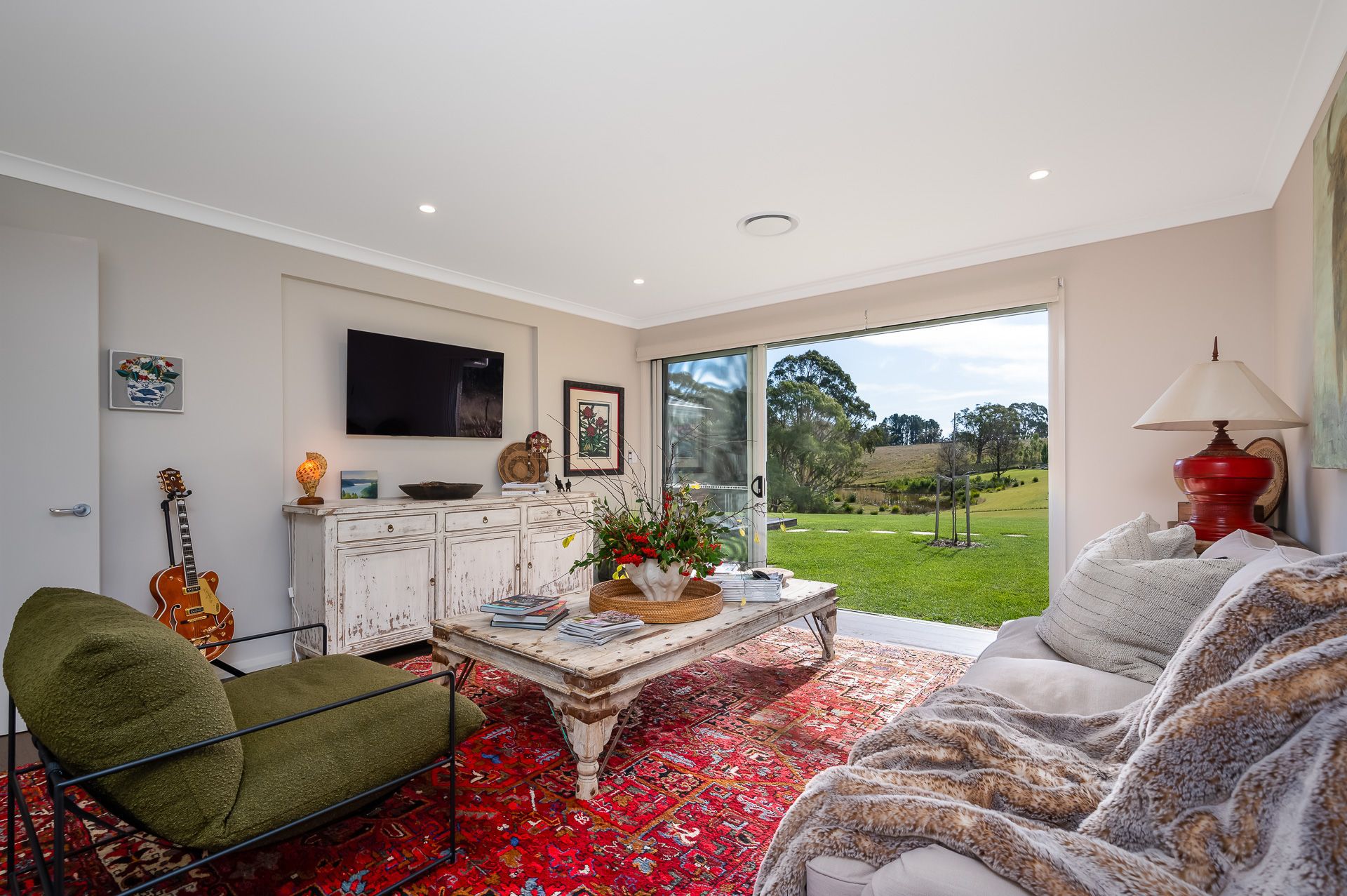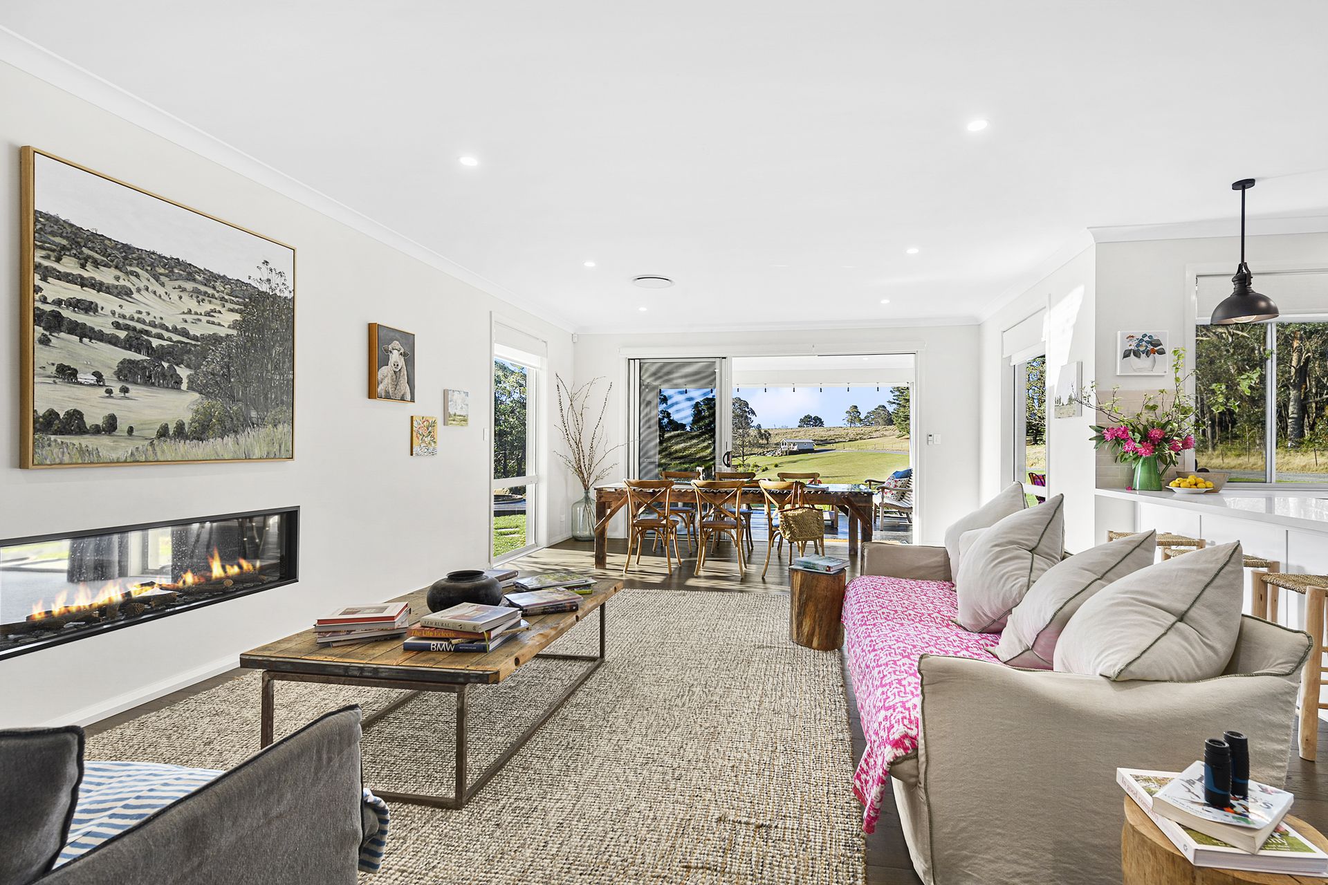 * Open-plan lounge, dining room, and kitchen are at the heart of the home, opening out to a sun-drenched alfresco deck with elevated countryside vistas