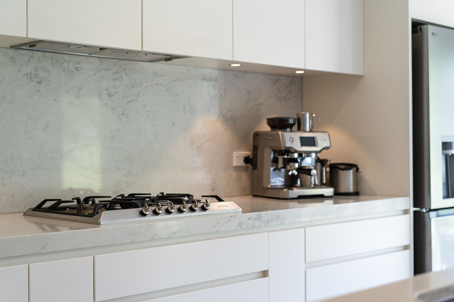 The large kitchen including eat-in-island, features elegant "Talostone in Carrara Marble" for splash-back and benchtops. Quality appliances: Smeg 90cm wall oven, microwave and 5-burner gas cooktop, Miele dishwasher and streamline soft-close cabinetry complete the look.