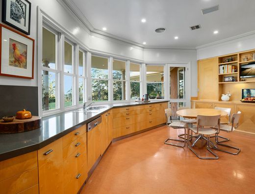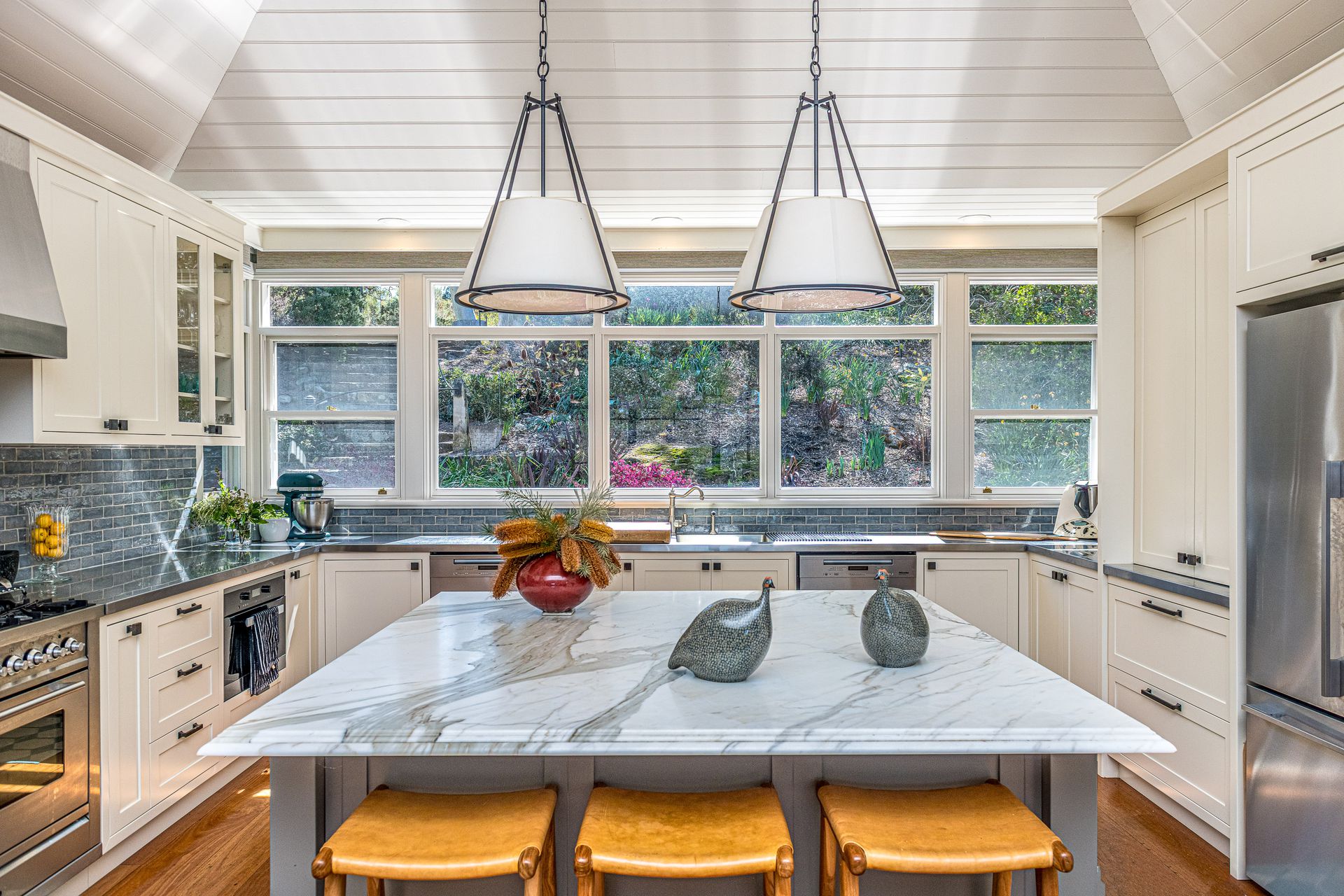 * Large kitchen family room with vaulted ceilings and expansive picture window; Eureka wood heater; designer kitchen includes large marble island, stainless steel countertops with integrated sinks, Ilve gas cooktop/electric oven, Miele Combi microwave/oven, two Miele dishwashers, Miele plate warmer and two pantry cupboards