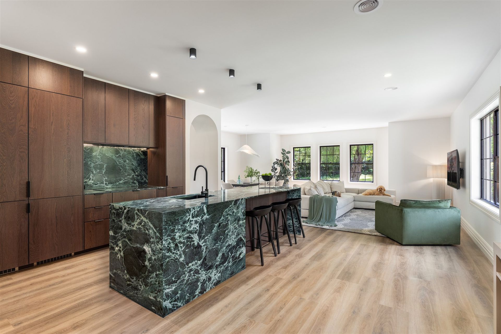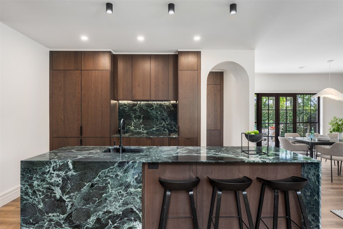 * The heart of the home is a bespoke designer kitchen featuring Italian Verdi Alpi marble benchtops, induction cooktop and integrated appliances