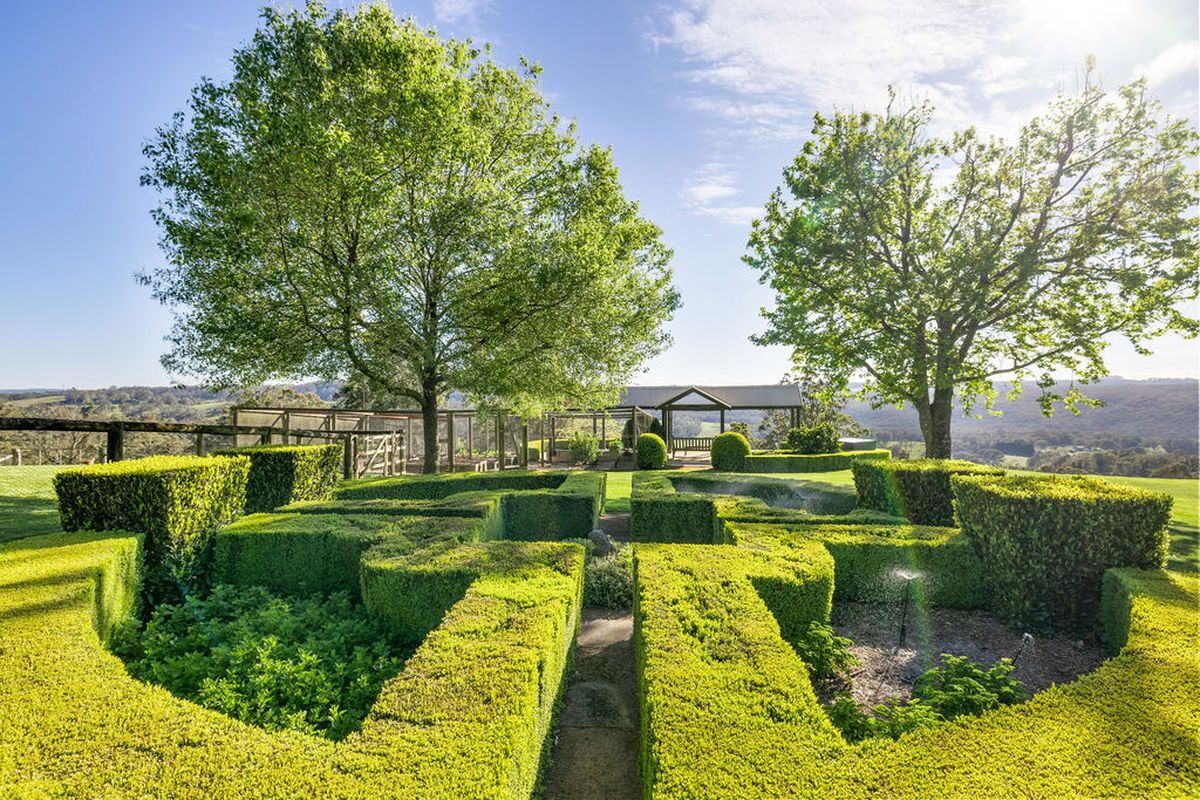 Meticulously landscaped gardens surround the estate, with a Claret Ash-lined driveway leading to the homestead. A feature dam enhances the entry, and native and ornamental gardens and lawns seamlessly connect the homestead, guest house, and pool house. Additionally, an enclosed vegetable garden with raised beds complements farm production.