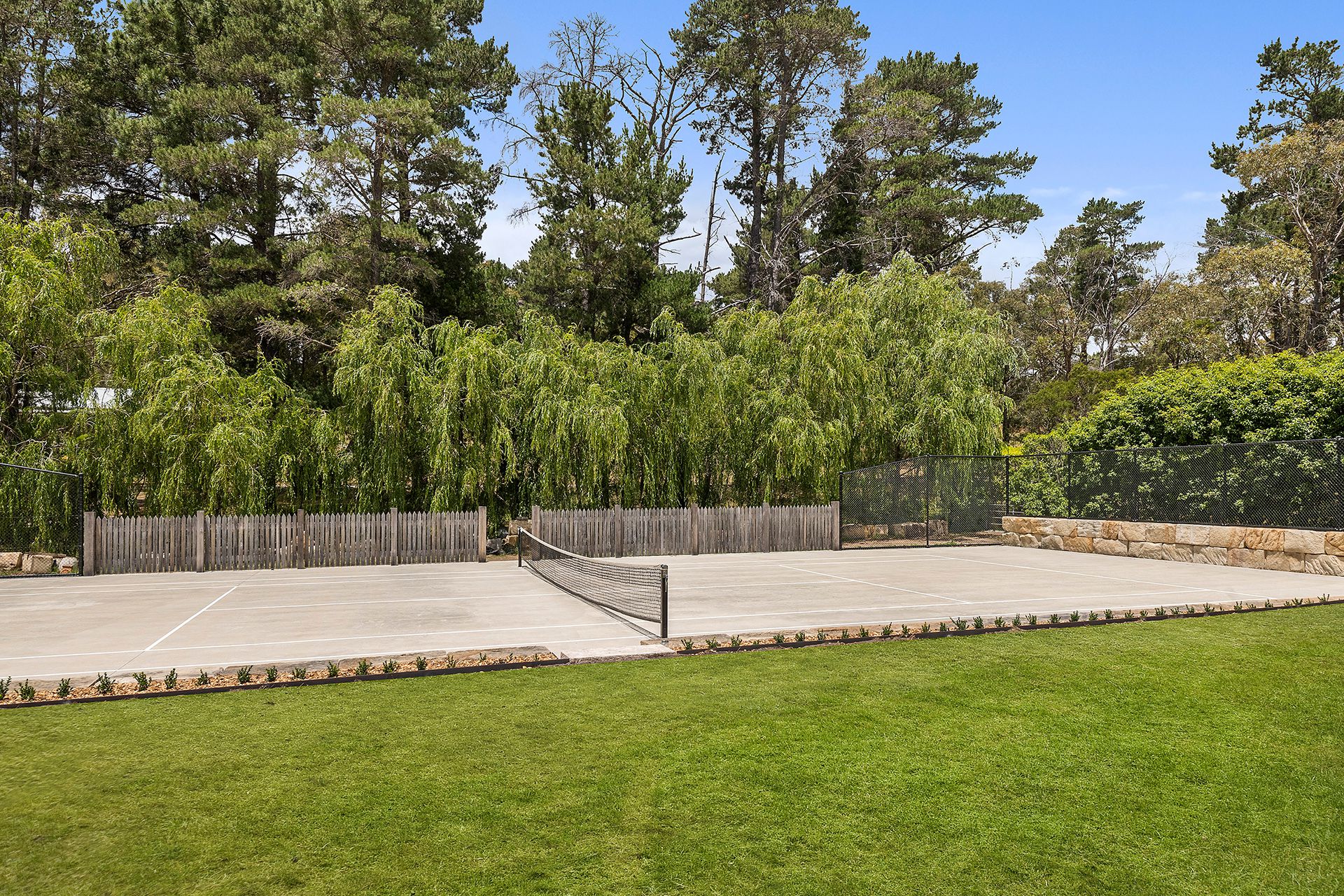 - Concrete tennis court, sandstone retaining walls