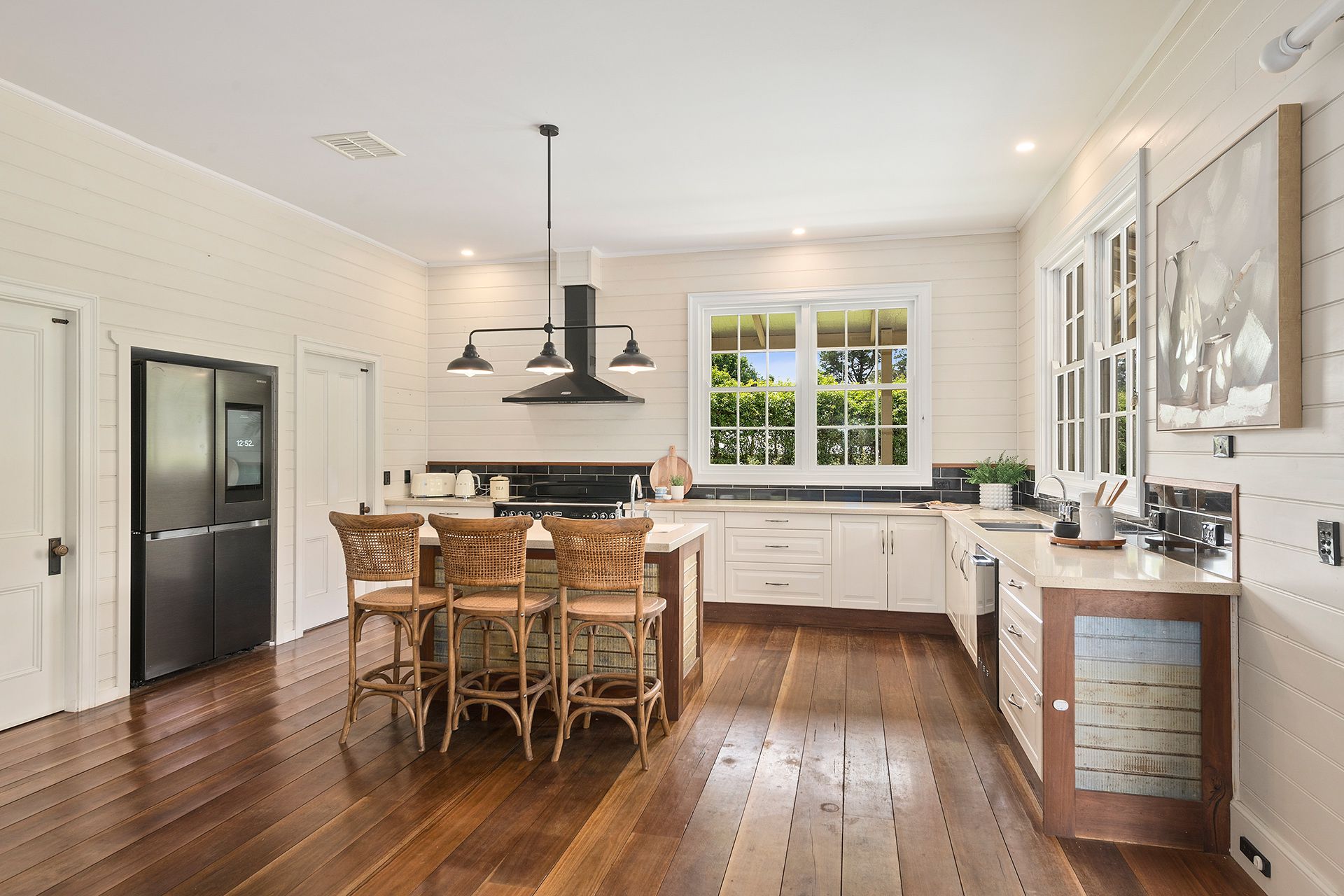 Sympathetically extended in c2010, with high ceilings and large dimensions creating a generous open plan family living and dining. Solid spotted gum flooring has been laid on an insulated concrete slab and the indoors flow effortlessly to various outdoor entertaining options, both covered and open. The laundry is adjacent to the kitchen and opens to the wrap around verandah.