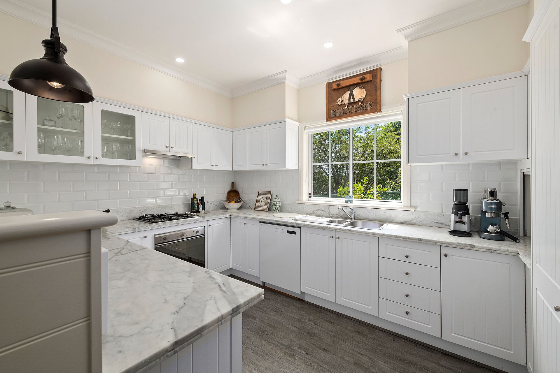 * Bright sunny kitchen with stainless steel appliances and marble benches