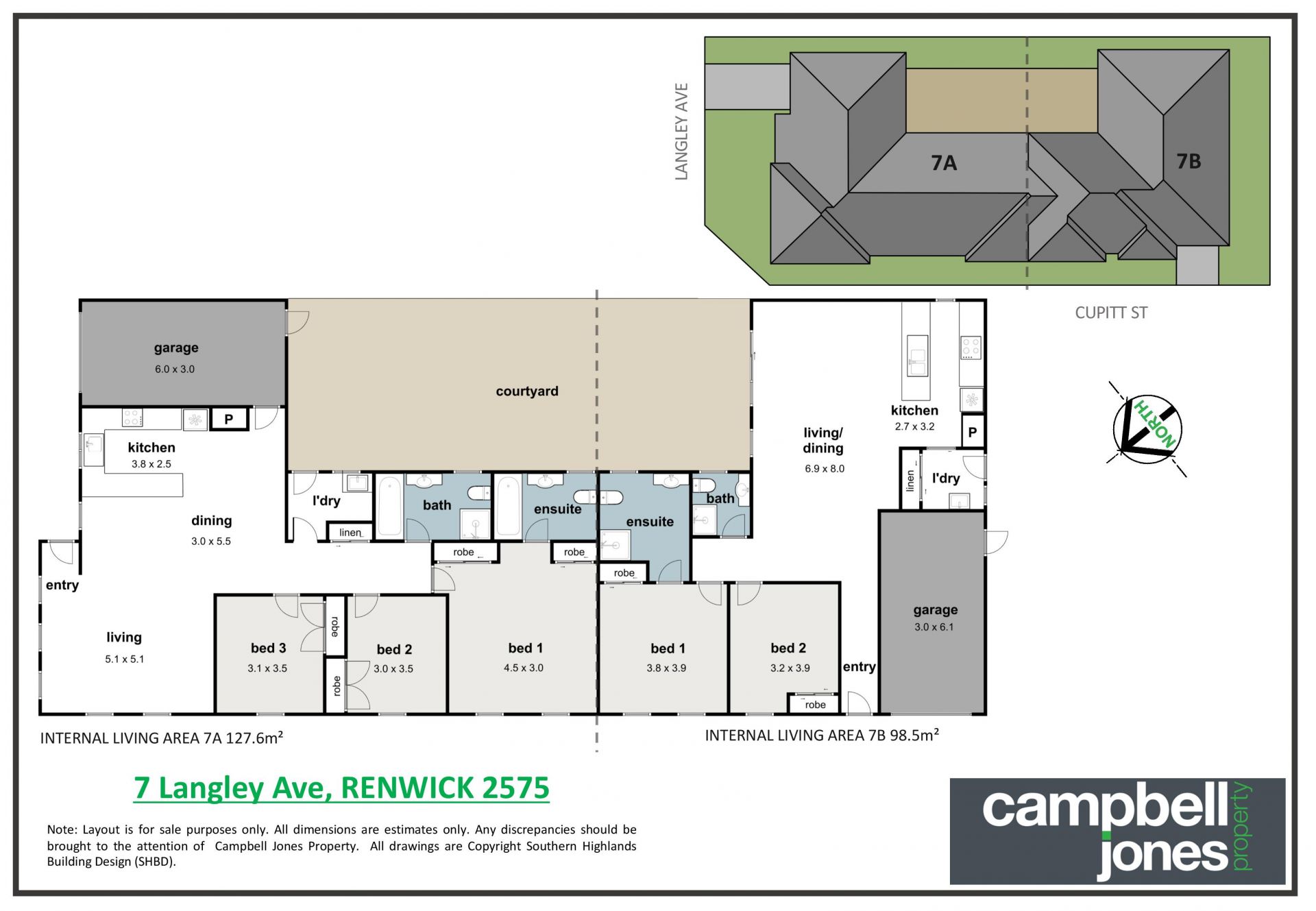 Situated on an established corner block, this home comprises two dwellings, one of 3 bedrooms 2 bathrooms, and the adjoining one of 2 bedrooms and 2 bathrooms. Both have a single garage with internal access.
